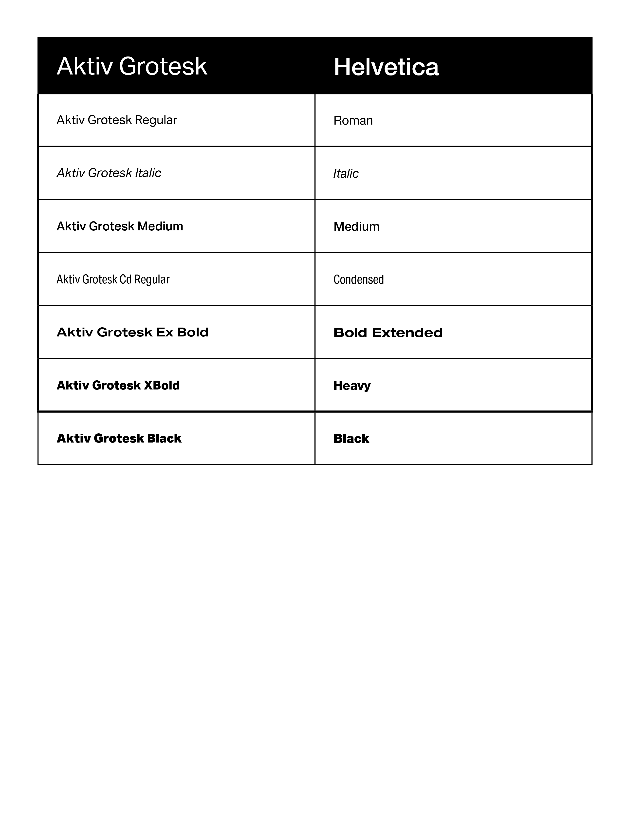 for the most part, use this table. if the helvetica says condensed, use aktiv CD and aktiv ex for helvetica extended.
