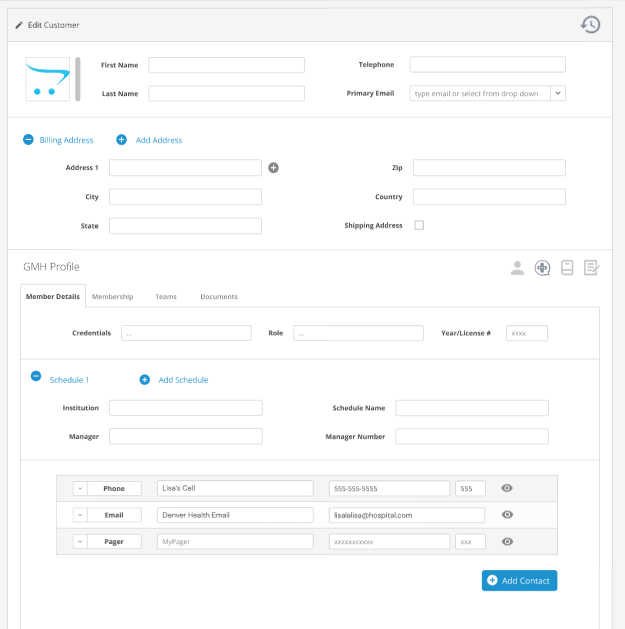 Des said that the credentials section isn't mandatory, and most people would probably just put all their titles on one line, so it's safe to keep it as one line instead of having the option to add more. I asked him about the year/license # thing, and he said the field should be able to handle both. So I've fixed this area to reflect the front end, I've added the color bar next to the avatar (default grey) and I've added the new contact info section.